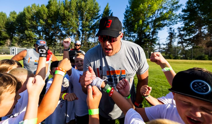 Denver Broncos offensive tackle Garett Bolles cheers in a huddle with kids at his Youth Football Camp at Skyridge High School in Lehi on Thursday, June 26, 2025. | Brice Tucker, Deseret News