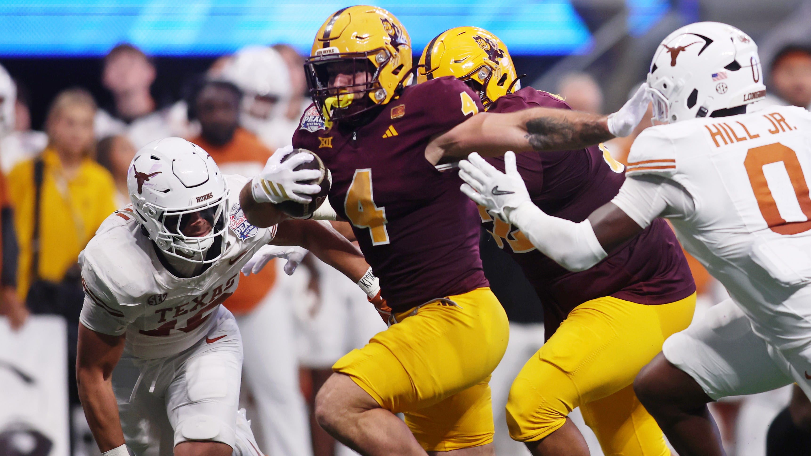 Arizona Sate running back Cam Skattebo addresses the media after the Sun Devils’ loss to the Longhorns in the 2025 Peach Bowl.