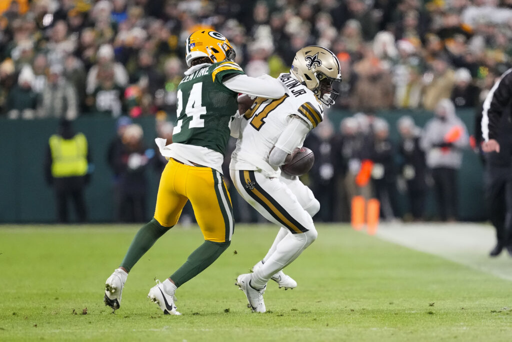 Dec 23, 2024; Green Bay, Wisconsin, USA; New Orleans Saints wide receiver Kevin Austin Jr. (81) loses the football after catching a pass in front of Green Bay Packers cornerback Carrington Valentine (24) during the second quarter at Lambeau Field. Mandatory Credit: Jeff Hanisch-Imagn Images