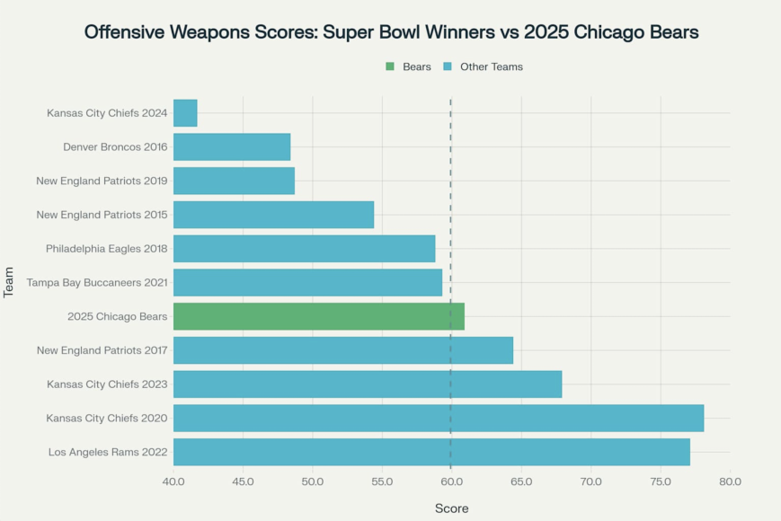 This is where the Bears step into the spotlight. So what’s the final number for the Bears? Their weapons score comes in at 60.9 — just above the Super Bowl benchmark of 59.9. That puts them in the championship weight class, and here’s the kicker — they’re deeper than most of those past champions.