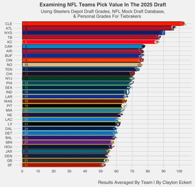 Through Steelers lenses, it’s unfortunate to see the Cleveland Browns as the team with the strongest pick value in the class. This was of course aided by the historic fall of QB Shedeur Sanders (top 10 projection, selected in the fifth round) with a 129.65 pick value, seventh best among all draft picks. They also didn’t “reach” compared to teams such as Pittsburgh, with the Browns lowest pick value being another QB: Dillon Gabriel (58.05).