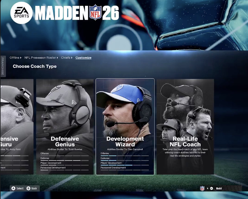 One of those updates is a new customization of your head coach in Franchise Mode. And that’s where Campbell comes in. To start selecting your head coach style, you are given four “archetype” choices: offensive guru, defensive genius, development wizard, or real-life NFL coach. Each selection has its own strengths and weakness, and during the selection process, each choice has the face of a current NFL coach to represent that kind of archetype. Andy Reid is the offensive guru, Todd Bowles is the defensive genius, and there’s Dan Campbell representing the development wizard: