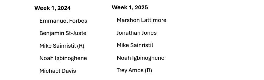 This side-by-side comparison of the Week 1 CB rosters for 2024 and 2025 demonstrates how thoroughly the secondary has been upgraded.