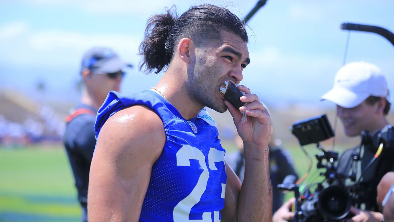 Puka Nacua munched on a spam musubi at the MauiCamp. (Spectrum News/Brian McInnis)