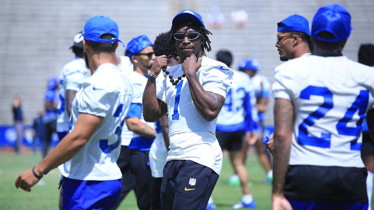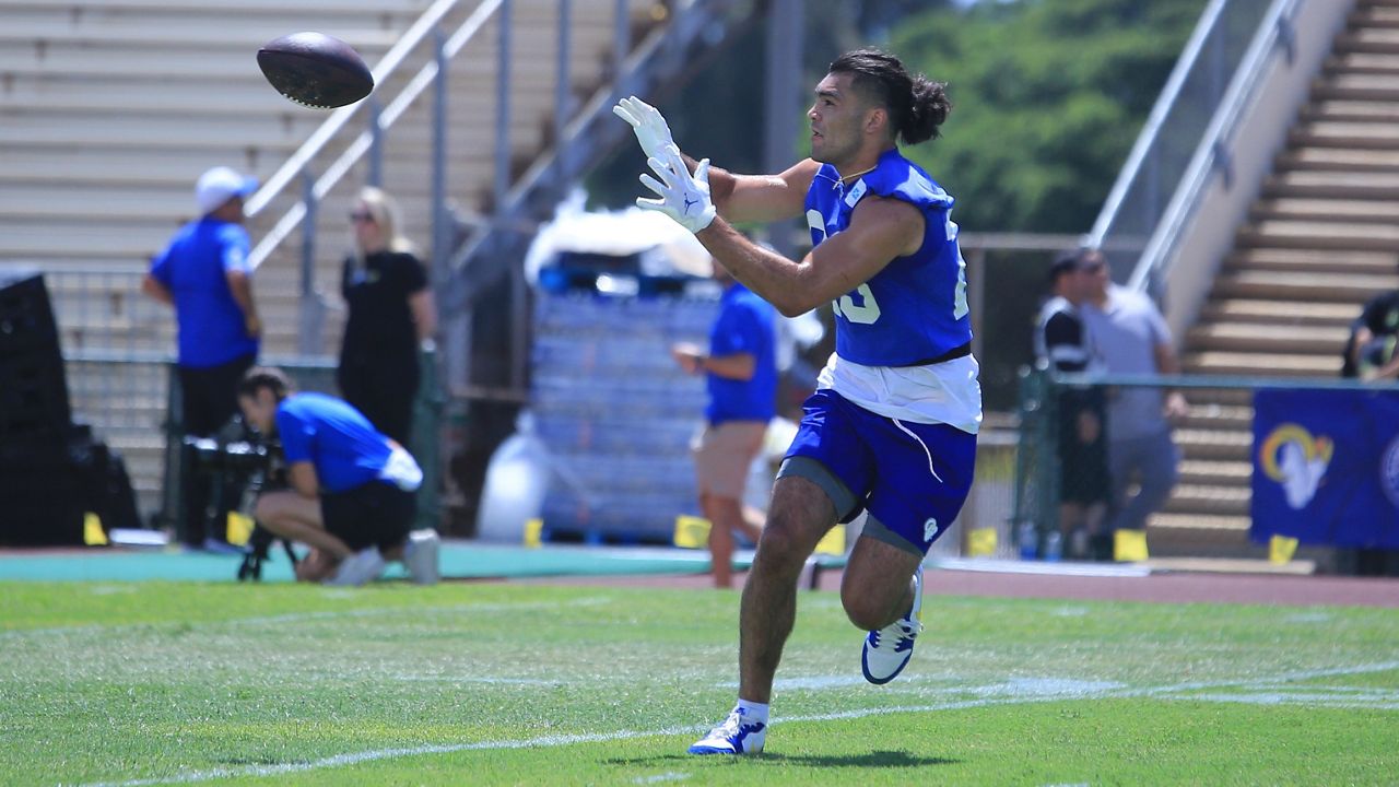 Puka Nacua caught a pass from Matthew Stafford during the team’s June 17 walkthrough at War Memorial Stadium. (Spectrum News/Brian McInnis)
