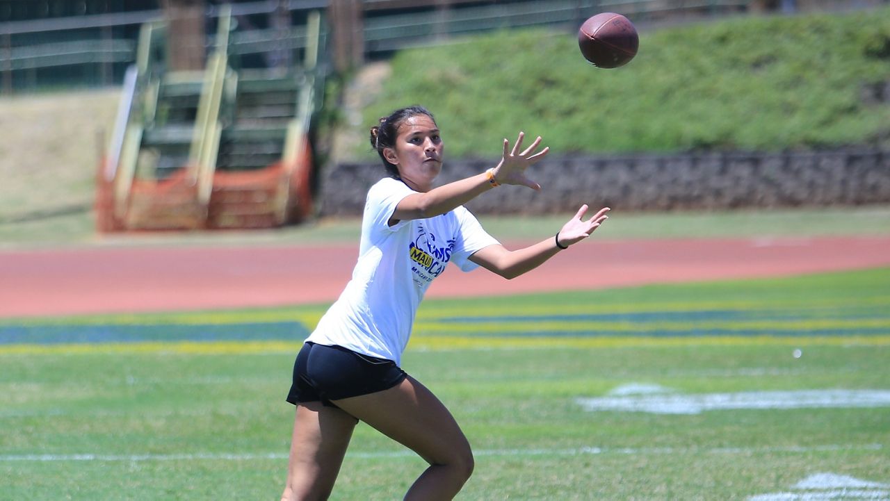 A girls flag football clinic participant caught a pass. (Spectrum News/Brian McInnis)