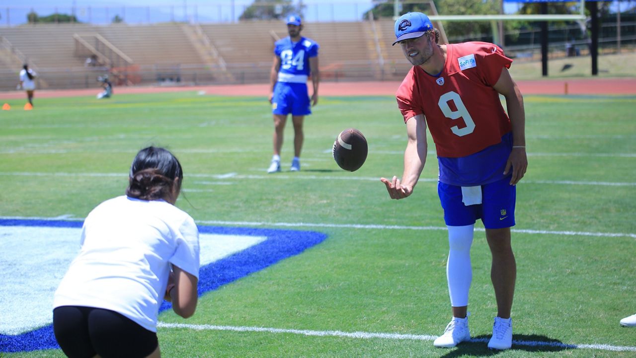 Quarterback Matthew Stafford flipped a snap to a clinic participant. (Spectrum News/Brian McInnis)