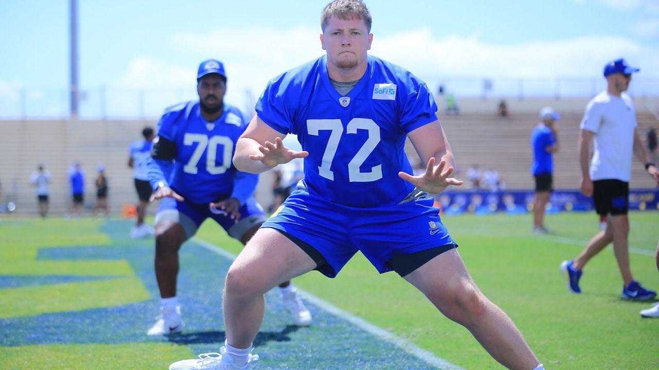 Rams tackle Trey Wedig (72) and lineman KT Leveston (70) did a slide drill. (Spectrum News/Brian McInnis)
