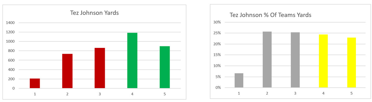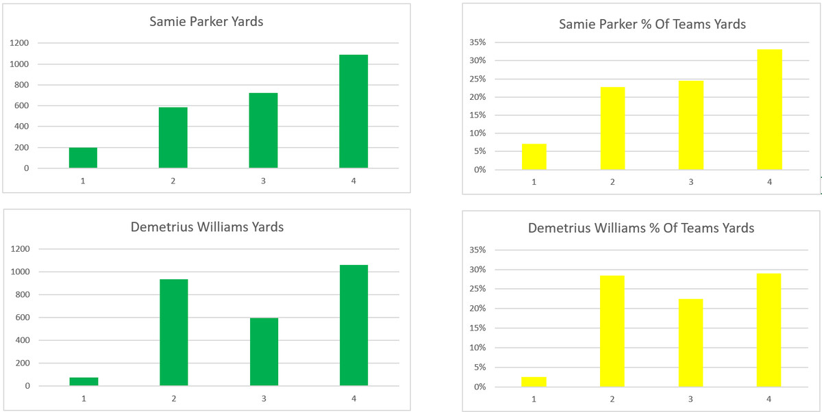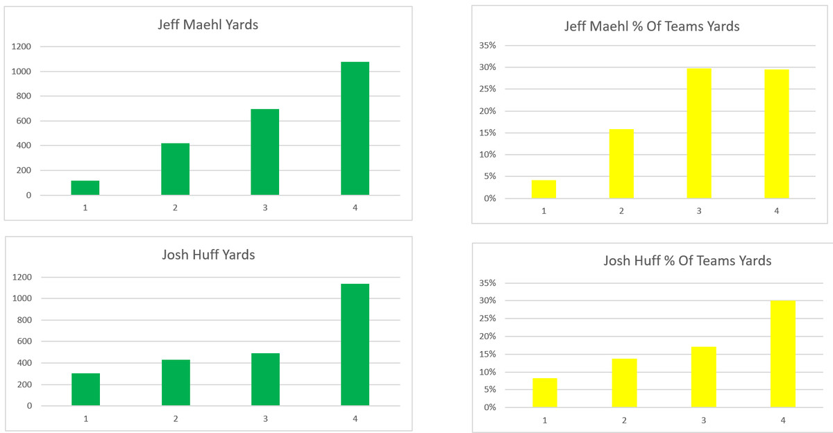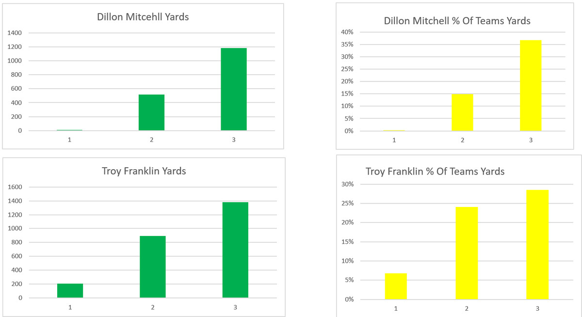 After a quiet freshman year, each of these players took a significant leap in their second season, contributing at least 421 yards and 14% of the team’s receiving output.