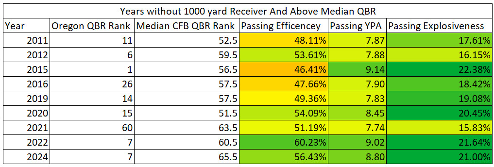 Since 2011, here are the seasons when Oregon didn’t have a 1,000-yard receiver but still had an above median QBR from the starting QB.