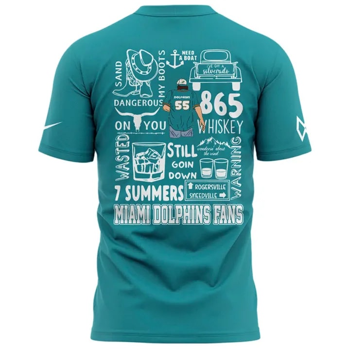 Shirt Color: The T-shirt color is a solid teal green, which is identical to the Miami Dolphins’ iconic team color, so fans can instantly identify the shirt as belonging to the NFL team.