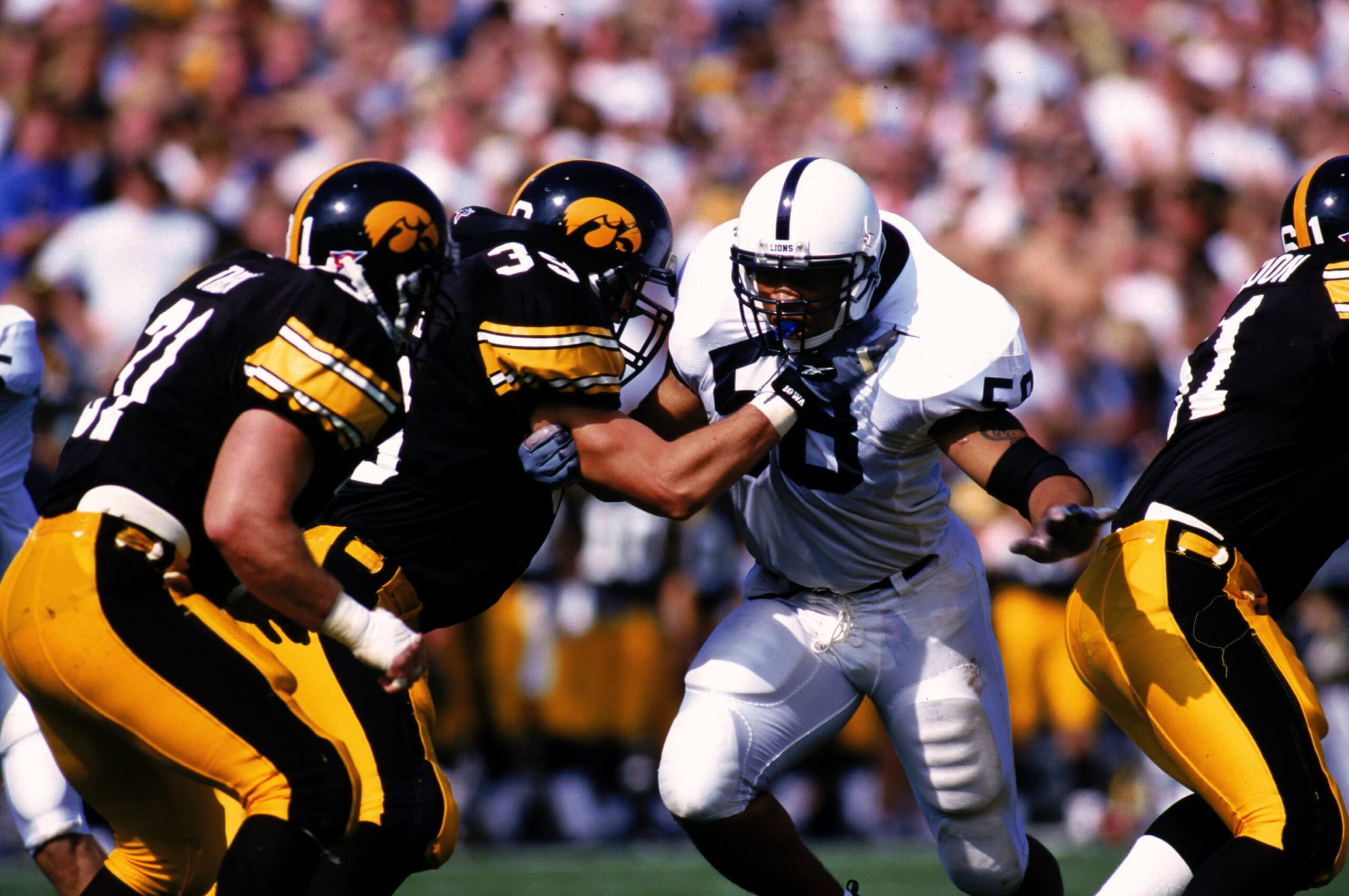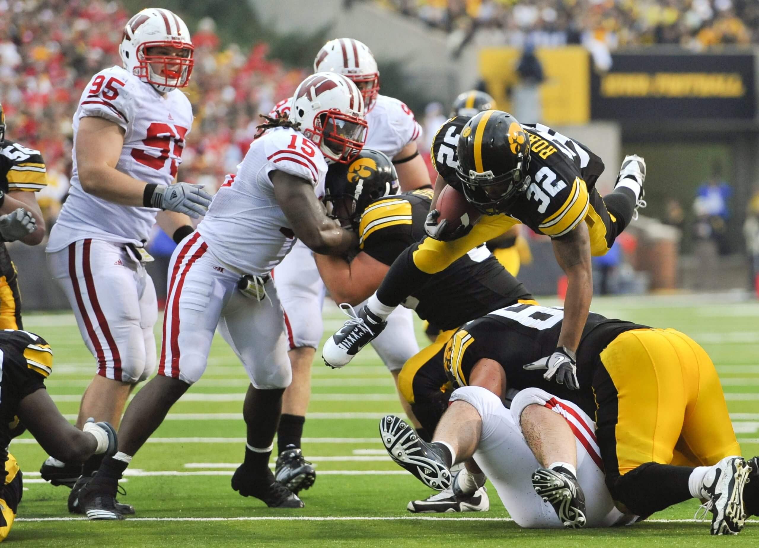 Biggest game: In 2010, top-15 teams collided in Iowa City with 30 draft picks (15 on each side) and battled through eight lead changes. A fake punt, a twisting TD by Wisconsin’s Montee Ball and a blocked PAT from J.J. Watt led to a 31-30 Badgers win. The victory propelled Wisconsin to a share of the Big Ten title.