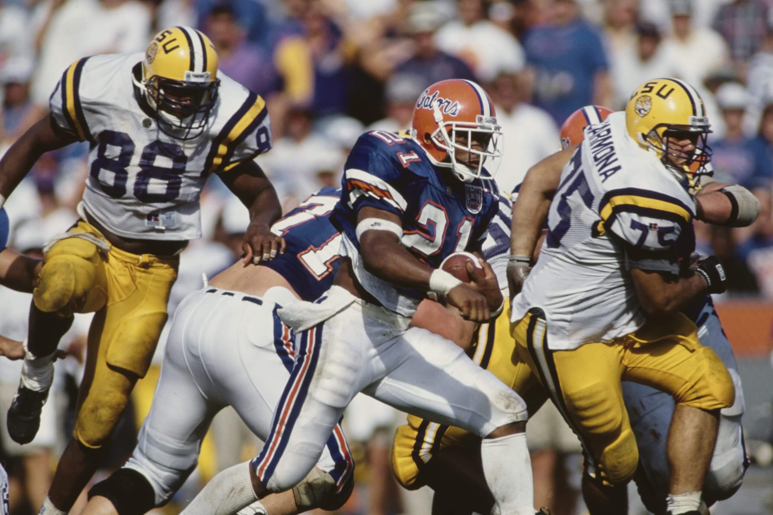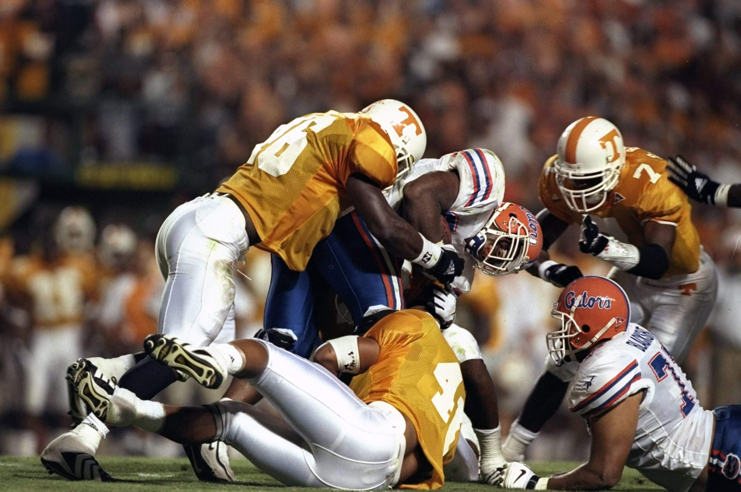Biggest game: No. 2 Georgia’s hopes of an unbeaten season appeared dashed approaching the final minute of its 1980 clash with the No. 20 Gators. Down 21-20 and facing third-and-11 at the 7-yard line, Bulldogs QB Buck Belue rolled right and threw across his body to Lindsay Scott at the 25-yard line. With Georgia announcer Larry Munson shouting, “Run Lindsay!” the receiver outraced the defense for a 93-yard TD and a 26-21 victory. The Bulldogs later won the national title.