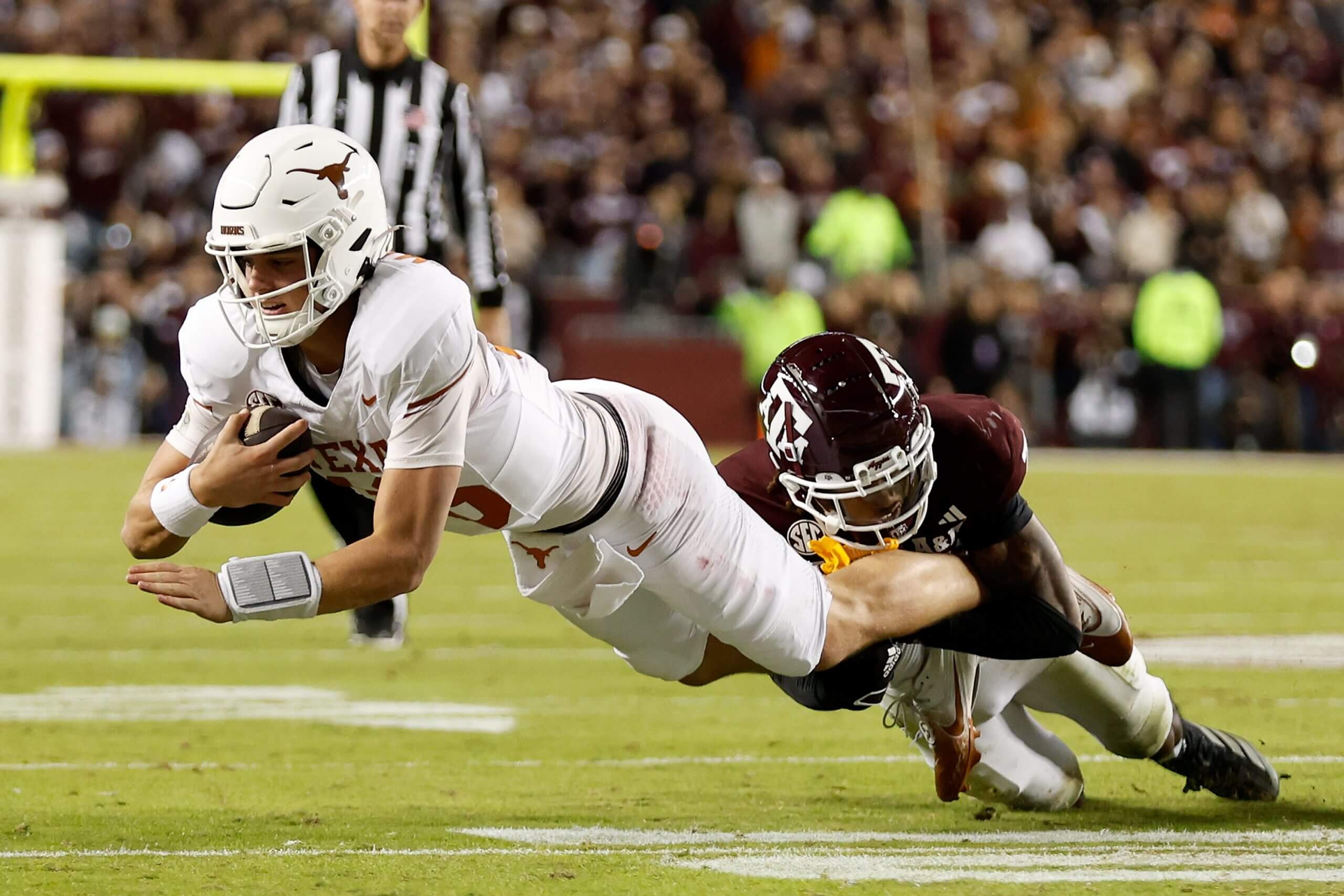 Both universities mention the other in fight songs. The opening lyric to “Texas Fight” begins “Texas fight, Texas fight, and it’s goodbye to A&M.” The second verse of “Aggie War Hymn” starts with “Good-bye to Texas University. So long to the orange and the white.” Their rivalry has spanned three leagues. Both competed as Southwest Conference members from 1915 until it dissolved after 1995. The Longhorns and Aggies (plus Baylor and Texas Tech) merged with the Big Eight to form the Big 12 in 1996, and their mutual association lasted until 2012, when Texas A&M left for the SEC. Texas and Texas A&M reunited in 2024 when the Longhorns joined the SEC.Both teams have been ranked in 11 matchups, with Texas holding an 8-3 edge. They’ve met in the top 10 twice (1941, 1975) with each team winning one.