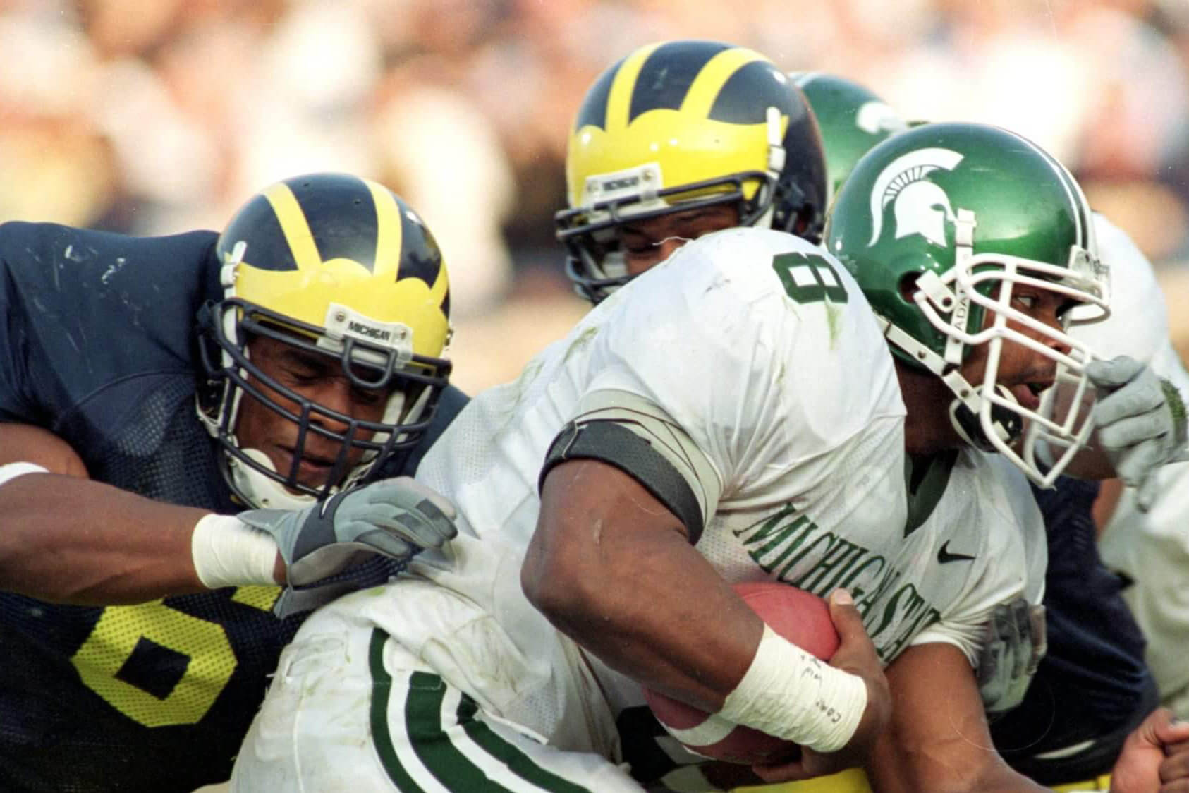 Biggest game: About a dozen games could qualify but none rates as high as their 2015 encounter. No. 12 Michigan led No. 7 Michigan State 23-21 with 10 seconds left. A bobbled snap on a punt led to a mid-air scoop by Michigan State’s Jalen Watts-Jackson, who returned the fumble for a touchdown with no time remaining. The victory led the Spartans to the Big Ten title and a Playoff berth.