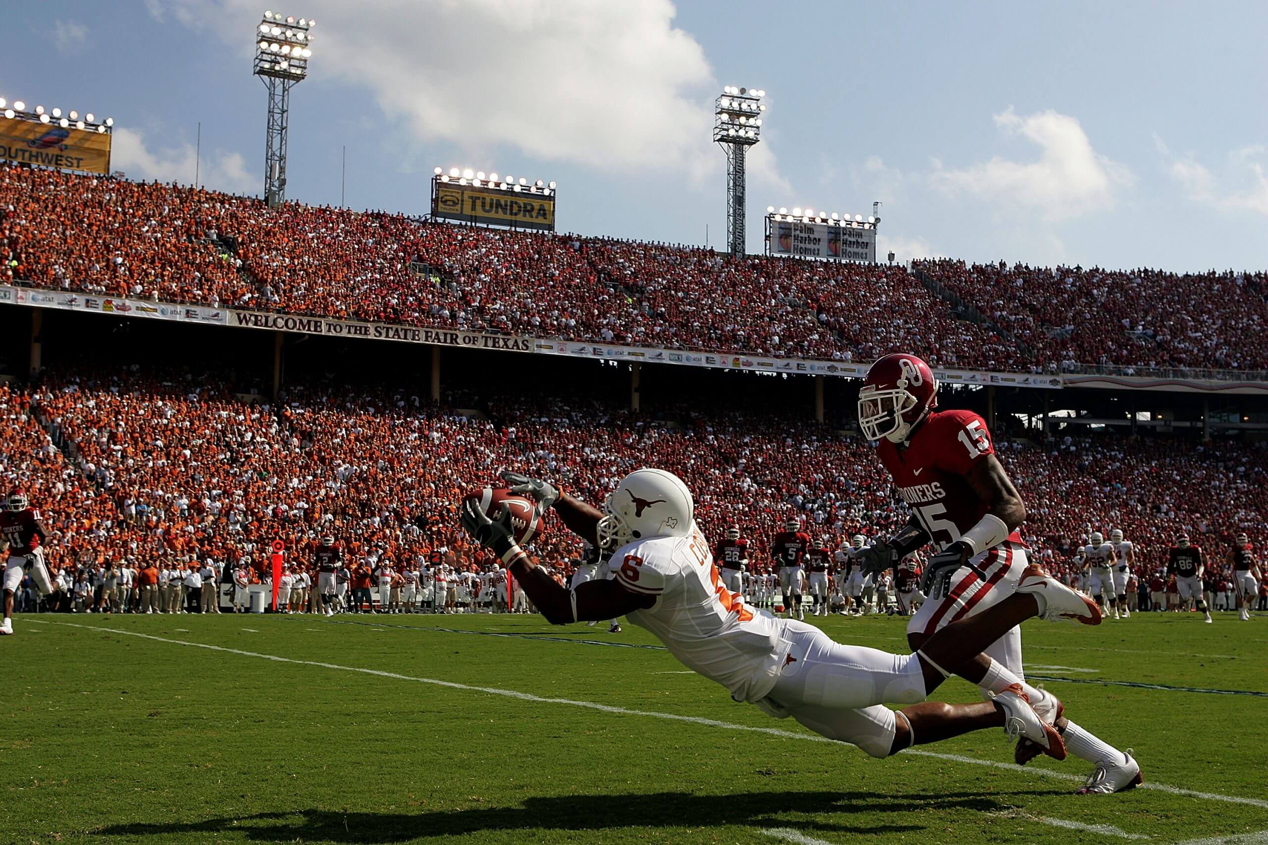 Oklahoma-Texas has called the Cotton Bowl in Dallas home since 1932. The seating arrangement splits at the 50-yard line with crimson and burnt orange circling opposite sides of the field.Oklahoma-Texas has an unusual trajectory among rivalries. They briefly competed together in the Southwest Conference (1915-19), then battled as nonconference foes from 1920 until their leagues merged into the Big 12 in 1996. In 2024, they joined the SEC together. The rivals have played 44 times as AP-ranked foes (Oklahoma 24-17-3) and 17 times as top-10 foes (Oklahoma 9-7-1).