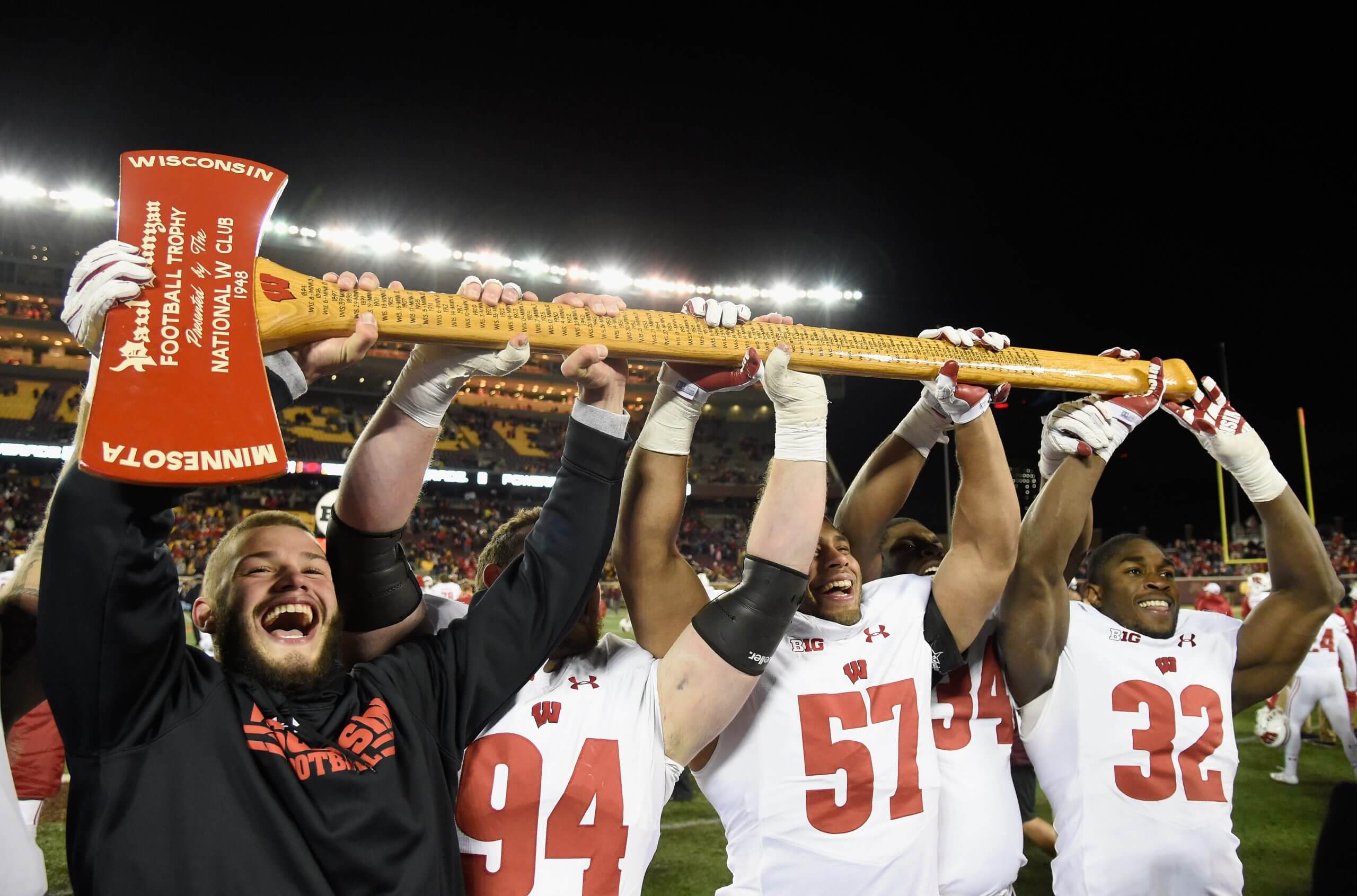 Wisconsin and Minnesota have played five more games against one another (134) than any other FBS series. In addition, the Gophers and Badgers have played every year since 1907 and have missed just one season on the gridiron (1906) since their first kickoff.There are few traveling trophies more recognizable than Paul Bunyan’s Axe. The winners take the Axe to each goal post and make chopping motions. They originally played for the “Slab of Bacon,” but it became lost in the 1940s and was discovered in 1994 at a Wisconsin storage facility. The Badgers refuse to hand it to the Gophers despite Minnesota winning it last.The Badgers are 7-0 in meetings in which both teams were ranked. Unranked Wisconsin also upset No. 3 Minnesota in 1961.