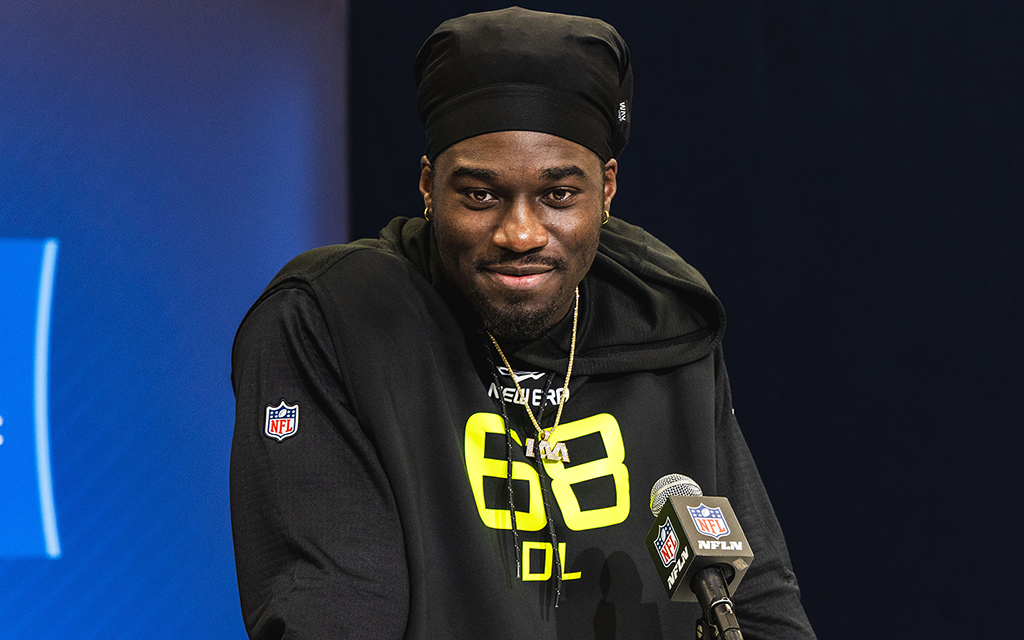 University of Michigan NFL Draft prospect Kenneth Grant speaks at the 2025 NFL Combine on Feb. 26, 2025. (Photo by Samuel Nute/Cronkite News)