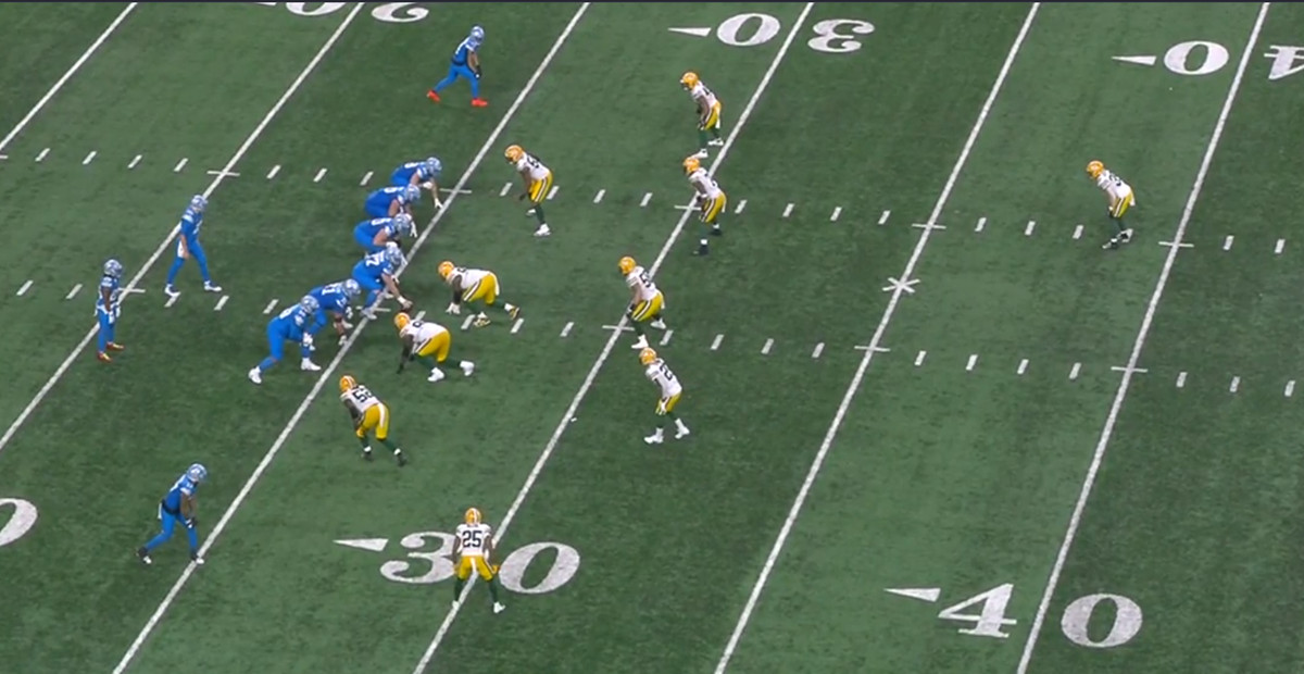 It’s actually fairly difficult to get a read on whether the Packers are in zone or man because the Lions spread them out and then ran right at them, one of the rare times that zone and man look kind of the same. (I think this zone because no one was breaking on Gibbs immediately, but who is to say?)