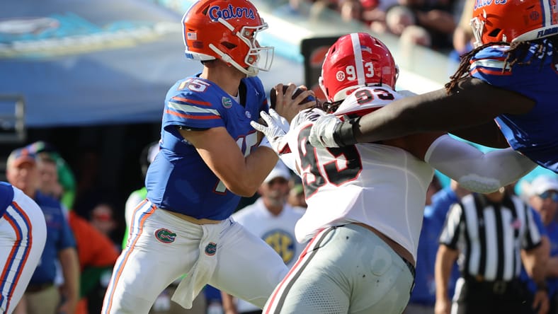 Oct 28, 2023; Jacksonville, Florida, USA; Georgia Bulldogs defensive lineman Tyrion Ingram-Dawkins (93) forces a fumble by Florida Gators quarterback Graham Mertz (15) during the first half at EverBank Stadium. Mandatory Credit: Kim Klement Neitzel-USA TODAY Sports