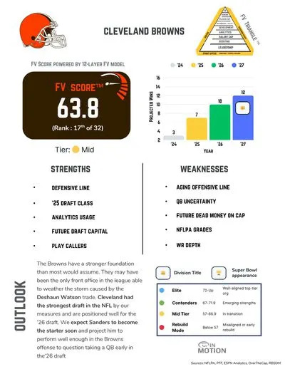 “The FV Triangle is designed to evaluate how well a franchise is structurally built for sustained success — not just in 2025, but over the next three seasons. In the Browns’ case, the combination of roster and coaching infrastructure is stronger than most would suppose, despite the three wins last year. The big variable now is quarterback development — and how the roster handles pressure in a season that could define the trajectory of this era.”