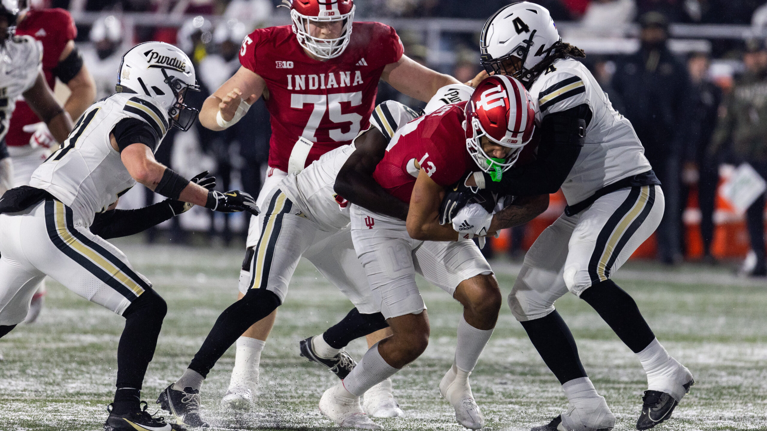 Indiana Hoosiers wide receiver Elijah Sarratt (13) is tackled by Purdue Boilermakers linebacker Kydran Jenkins (4). (Photo by Trevor Ruszkowski-Imagn Images)