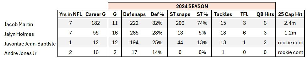 The remaining 3-horse race includes a 2nd-year player drafted by Adam Peters in the 7th round last year, Javontae Jean-Baptiste, and a pair of 7-year veterans in Jalyn Holmes, who started last season with the Jets but finished with Washington, and Jacob Martin, who has played for 6 NFL teams and was with the Bears last season where he spent nearly 2 months on IR to open the season.