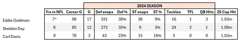 Eddie Goldman has gotten a lot of attention from Commanders fans and media after being signed in March free agency. While Goldman was active for 17 games with the Falcons in 2024, he played 30% of his teams defensive snaps, compared to 35% for Day and 23% for Davis.