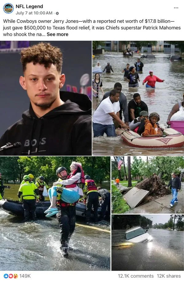 As one example of a user sharing the rumor, on July 7, the manager of a Facebook profile named NFL Legend posted (archived) a photo of Mahomes alongside pictures allegedly showing victims of the recent floods. The post received more than 158,000 reactions, as of this writing.