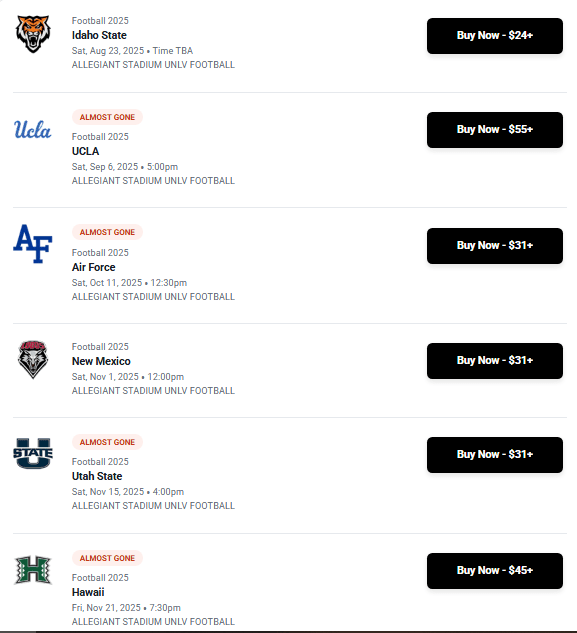 One of the best deals to watch football in Allegiant Stadium is spending $24 plus fees/taxes for a UNLV football game when Idaho State come to town Aug. 23. The costliest ticket for a UNLV football game is a $55 get-in price UCLA visits Allegiant Stadium Sept. 6.