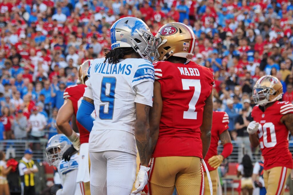 Jan 28, 2024; Santa Clara, California, USA; Detroit Lions wide receiver Jameson Williams (9) talks with San Francisco 49ers cornerback Charvarius Ward (7) during the first half of the NFC Championship football game at Levi’s Stadium. Mandatory Credit: Kelley L Cox-USA TODAY Sports