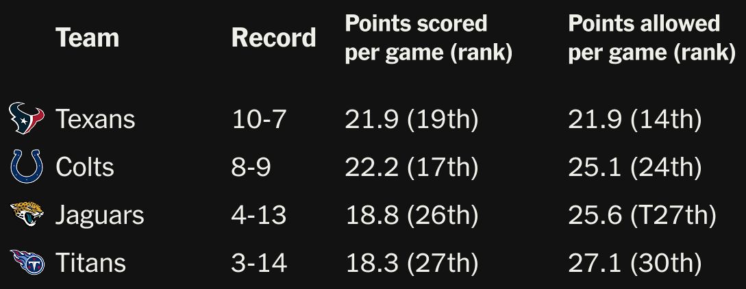 This offseason, Houston hired a new offensive coordinator, the Colts added quarterback competition in Daniel Jones, the Jaguars overhauled everything and the Titans are betting Cam Ward is the franchise quarterback they’ve searched for since locking the late Steve McNair out of their facilities. They each hope to improve the league’s worst offensive division: