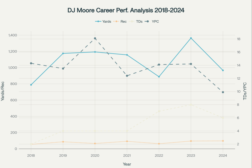 DJ Moore’s Career Performance Analysis from 2018-2024 (Yards, Receptions, TD’s, & Yards/Catch)