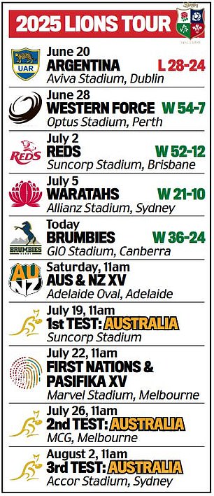 Mail Sport’s NIK SIMON was at the GIO Stadium in the Australian capital to run the rule over every Lion – this is his verdict on who made a grab for a Test place and who has it all to do with only one warm-up game remaining.Â