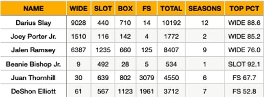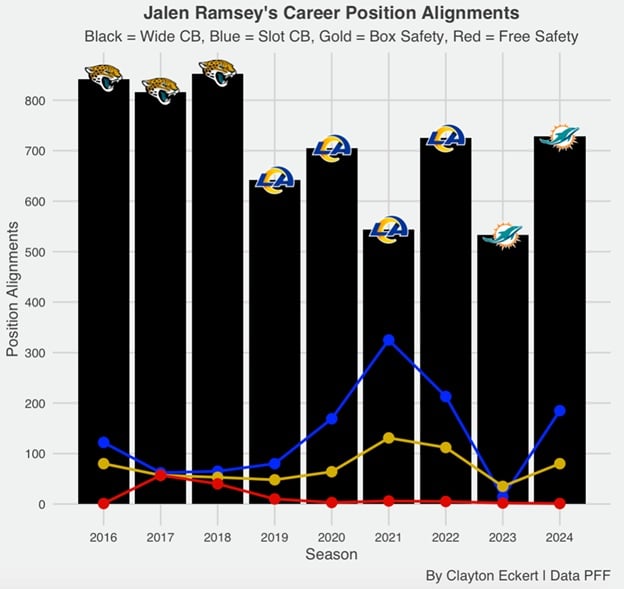This gives clear context to Ramsey’s usage over his nine-year career to date. The black bars represent wide cornerback snaps, illustrating that’s where he’s played most of his career. This was particularly the case in his early years with Jacksonville. Of the other alignments, slot CB was far less, but his second-highest usage.