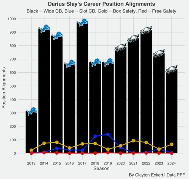 Slay is a six-time Pro Bowler (2017-2019, 2022-2024), one-time All-Pro (2017), and a Super Bowl champion last season with Philadelphia. He is very impressive, and when he was utilized more across the secondary (particularly with the Lions), he still played at a high level.