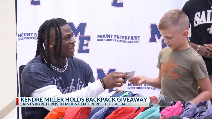 MOUNT ENTERPRISE, Texas (KETK) — New Orleans Saints running back Kendre Miller returned to his hometown of Mount Enterprise Saturday to hand out backpacks and sign autographs for kids in the community.