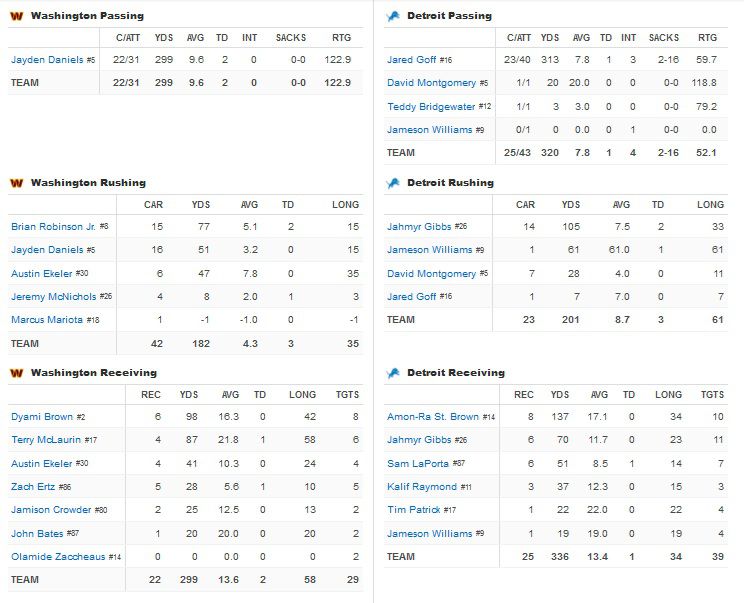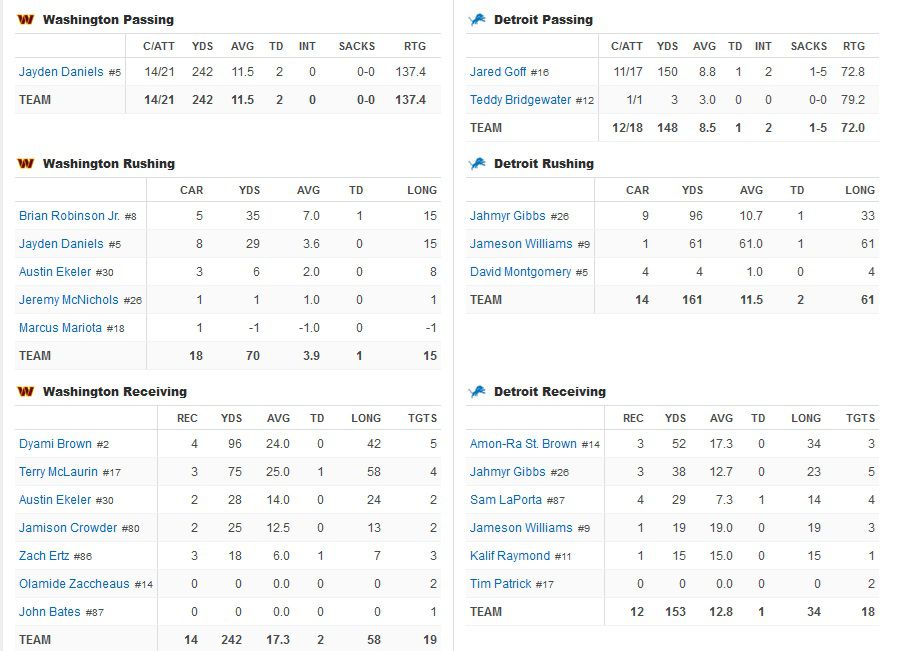 So far, the Lions have 189 total yards compared to 173 for Washington. Goff is 8-10 for 120 yards and a TD while Daniels is 10-16 for 132 yards. But Jahmyr Gibbs has 6 runs for 70 yards and a TD.
