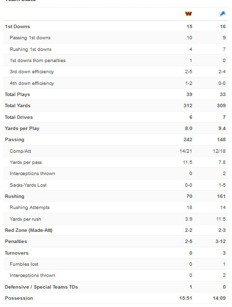 Instead, Washington was able to kneel down to end each half, with a 10-point lead at the end of the second quarter and a 14-point differential at the end of the game. The Commanders punted once, missed one field goal and failed one of four 4th-down plays, but did not turn the ball over at all.
