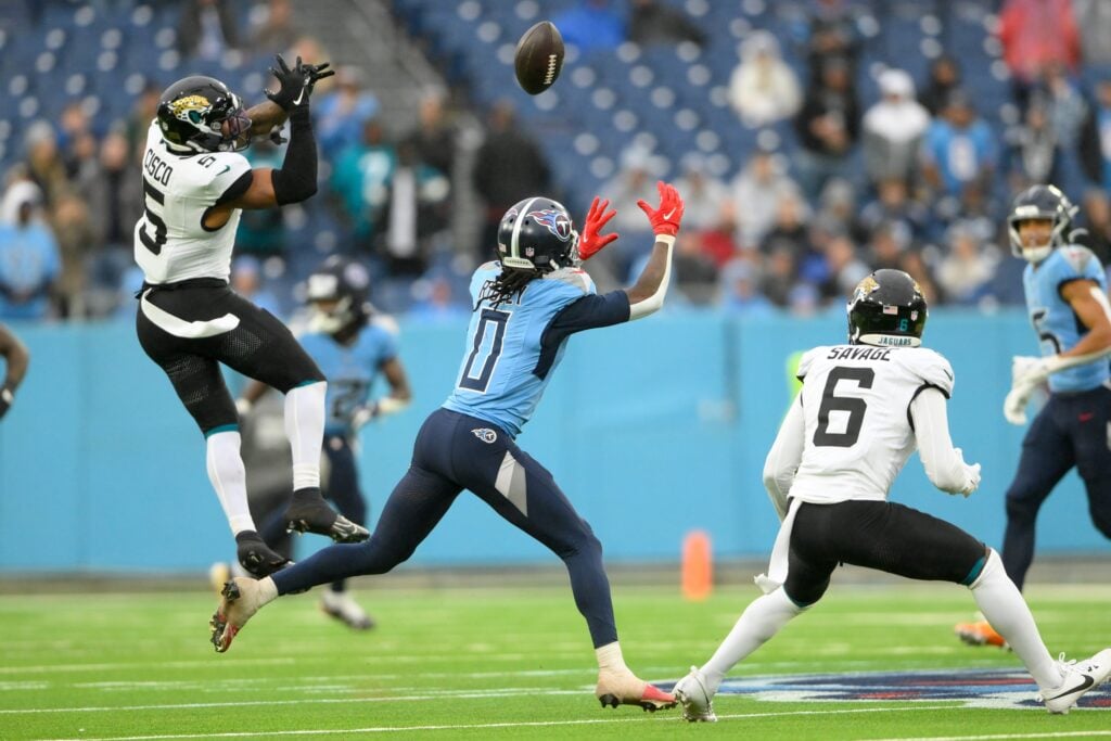 Dec 8, 2024; Nashville, Tennessee, USA; Jacksonville Jaguars safety Andre Cisco (5) tips the forth down pass to Tennessee Titans wide receiver Calvin Ridley (0) during the second half at Nissan Stadium. Mandatory Credit: Steve Roberts-Imagn Images