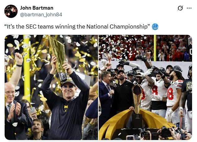 One college football fan took issue with a line in the trailer that said SEC teams usually win national titles, posting images of the two most recent title winners: Michigan and Ohio State, which are Big Ten schools.Â