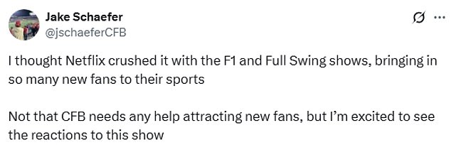 ‘I thought Netflix crushed it with the F1 and Full Swing shows, bringing in so many new fans to their sports,’ wrote one fan of the trailer on X, formerly Twitter. ‘Not that CFB needs any help attracting new fans, but I’m excited to see the reactions to this show.’