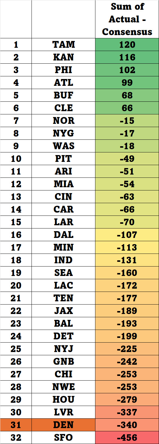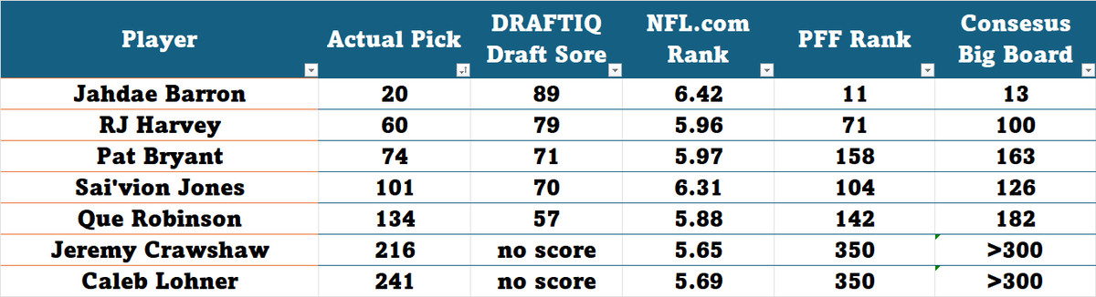 If we analyze how every team did in the draft, the values are in the table below. The Broncos reached quite a bit according to the big board, but much of this is from the day 3 picks who didn’t show up on the top 300 consensus big board.