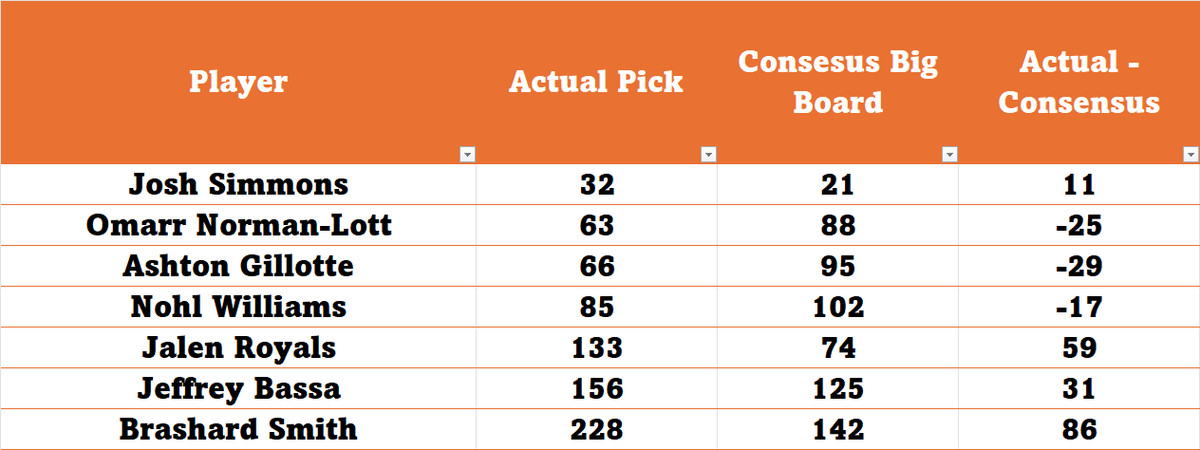 It hurts to see KC ranked so highly here but according to the consensus big board, they absolutely killed it on day 3 finding value with Jalen Royals, Jeffrey Bassa and Brashard Smith. All three fell from where most thought that they would be drafted, with Smith having the biggest fall. He was taken 228th, and he was consensus 142nd.