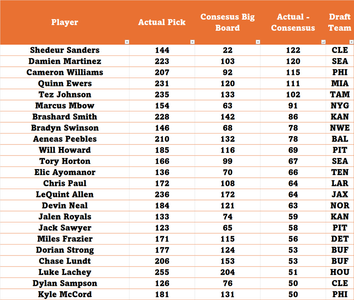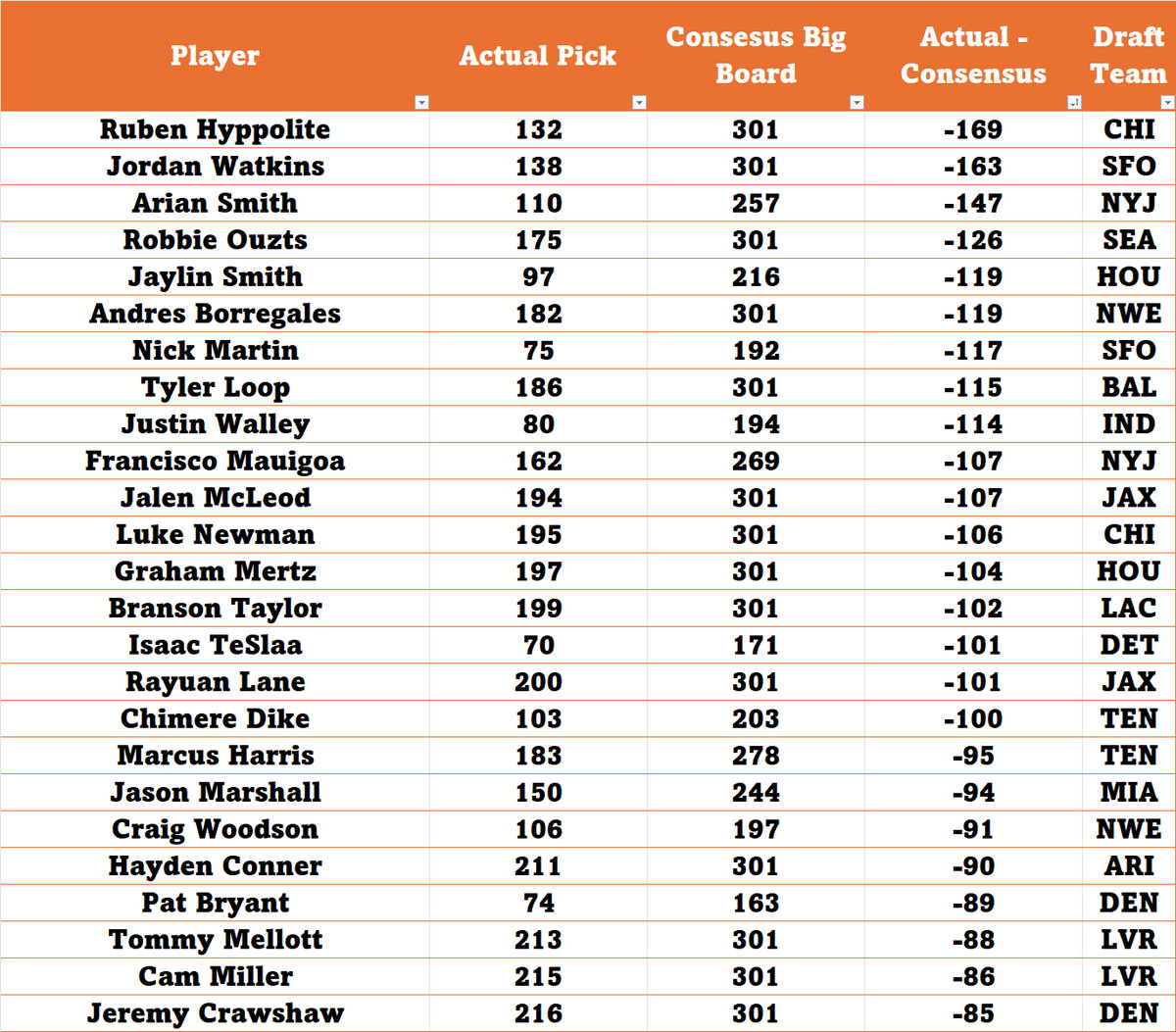 You’ll note that most of these guys did not rank in the top 300 on the consensus big board. So I assigned them a value of 301. If we looked at the guys who were on the board, Pat Bryant shows up as the 11th biggest reach in the draft behind: