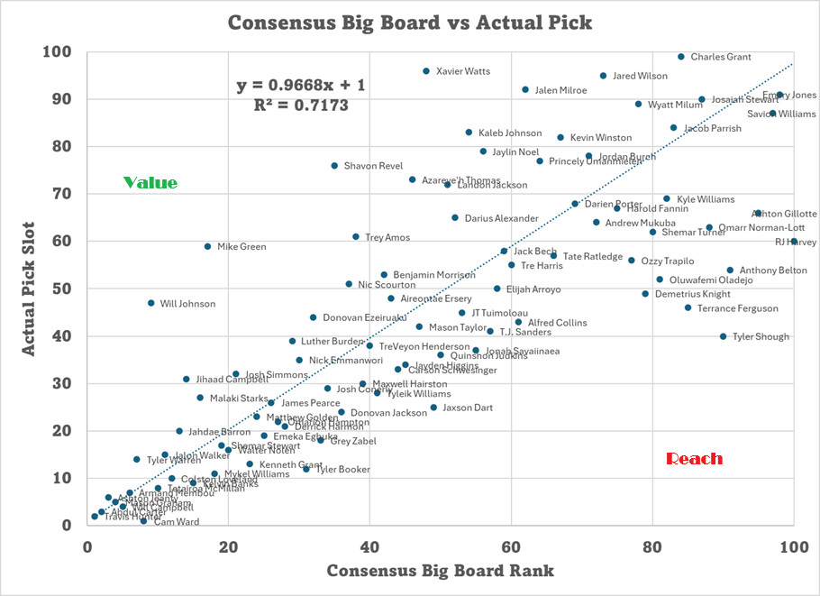 The consensus big board from the 2025 draft can be found here– the rankings are 1-300. NextGen stats and AWS have their DRAFTIQ score which I wrote quite a bit about prior to the draft. Their rankings go from 50-100. NFL.com has their draft grades which range from 5.50-8.0 (an odd scale to say the least). PFF grades/ranks their top 350 players in the draft.