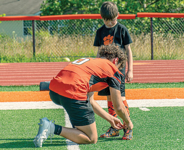 An Elkins High School football player helps a youngster with his shoe during Tiger Youth Football Camp held Saturday at Tiger Stadium.
