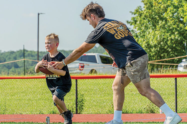 A participant takes a handoff at the Tiger Youth Football Camp held Saturday at Tiger Stadium. A total of 68 campers took part in the event.