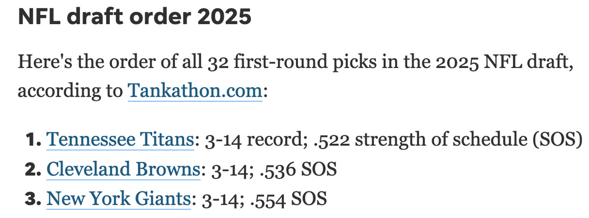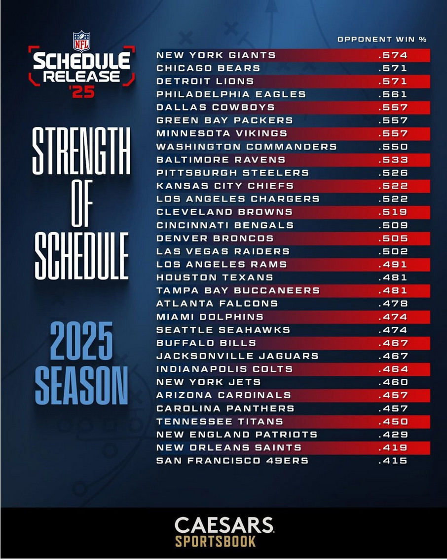 In fact, you can say that the NFL did the Giants dirty twice – not only do they face what appears to be a daunting set of opponents throughout this season, but Cam Ward is not their rookie quarterback because the Giants, tied with Tennessee and Cleveland for the worst NFL teams last season with 3-14 records, were relegated to the No. 3 pick in the 2025 NFL Draft because their 2024 strength of schedule (SOS) was the toughest of the three teams: