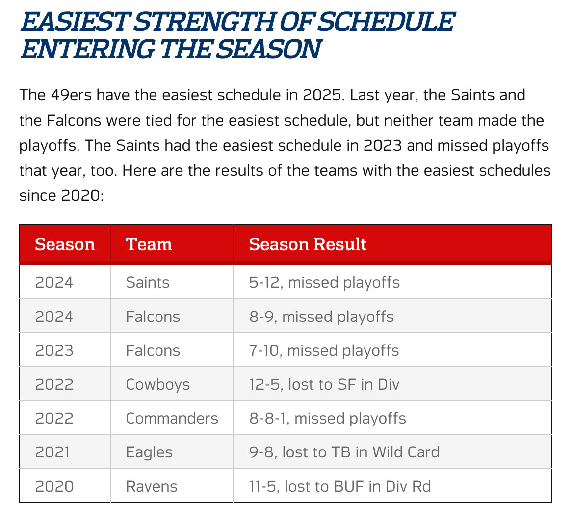 The bottom line is: Strength of schedule doesn’t mean much. There’s no way to know what the 2025 Giants will be until they get well into their season. In 2017 the Giants had 9.0 projected wins and won 3. In 2022 they had 7.5 projected wins and won 9.5. In July we just don’t know who the good and bad teams are going to be. With three new quarterbacks, each of them with their own question mark, we have absolutely no idea how good or bad the Giants are going to be. I’m glad Carl Banks is optimistic; he knows more than I do. For now, that’s enough.